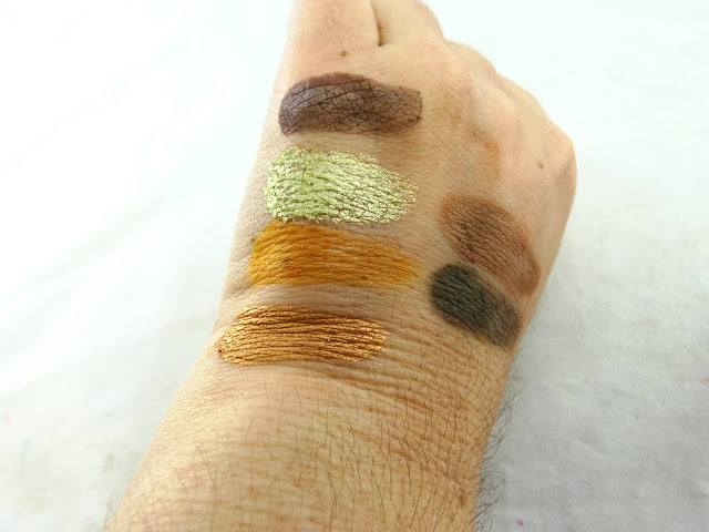 Was die Farbauswahl und Zusammenstellung angeht, muß ich ehrlich sagen, daß ich mir die Palette eher nicht gekauft hätte. Alle Farben haben ein Schimmerfinish - lediglich das dunkle Braun ist matt.